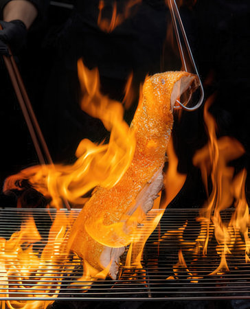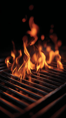 A close-up image captures the mesmerizing dance of vibrant flames on a grill. The fire, with its intense orange and yellow hues, contrasts sharply with the dark background. The grill's metal grates are visible beneath the flames, adding texture to the scene. The image evokes a sense of warmth and the primal allure of fire.
