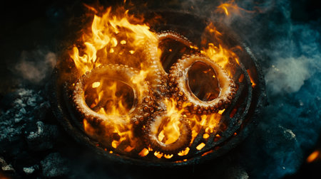 This captivating image showcases octopus cooking over an open flame, highlighting the art of grilling seafood with vibrant flames enhancing the dish's appeal.