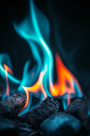 Close-up of Vibrant Blue and Orange Flames Dancing on a Dark Background with Copy Space