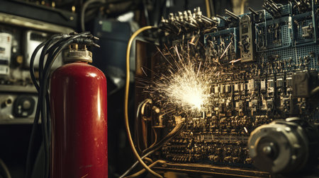 A close-up view of sparks emitting from a circuit board in a workshop setting, highlighting the electrical components and safety equipment, showcasing the industrial atmosphere.