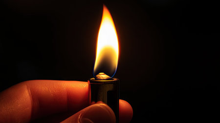 A dramatic close-up image capturing a hand holding a lighter igniting a vivid orange flame. The contrast between bright flame and dark surroundings creates an atmospheric mood.