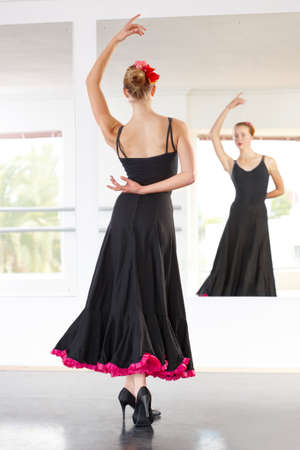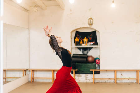 Carefully controlled passion. Young dancer performing flamenco in a dance studio.