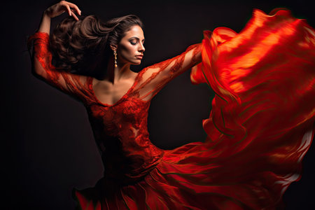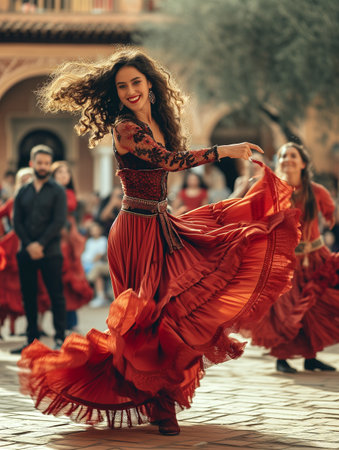 Spanish flag; flamenco dancer; traditional dress; motion blur; red and yellow; cultural performance; national identity; Spanish culture; dance heritage; passionate art; flowing fabric; dress ruffles; dynamic movement; cultural symbol; patriotic dance; traditional art; performance capture; Spanish tradition; folk culture; national colors; artistic movement; dance symbolism; cultural heritage; rhythmic motion; expressive art; Spanish soul; national pride; creative representation; symbolic dance; cultural identity; motion capture; artistic expression; folk tradition; patriotic expression