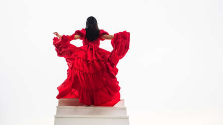 Rear woman with red long dress walking up on stairway to heaven with white background. Copy space for text. Holiday travel vacation concept.