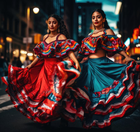 A dancer twirls with passion during a street festival at night. Her dynamic movement and the vibrant setting create an atmosphere of celebration.
