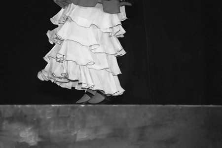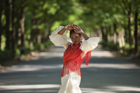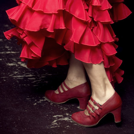 Beautiful woman dancing flamenco in Seville, Spain. She wears a red and black dress typical of a flamenco dancer with a lot of art, you can see the movement in the air of the frilly dress.
