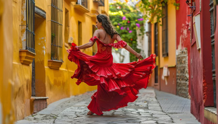 A flamenco dancer twirling in a dramatic red dress in a quaint alleyway in Seville, capturing the spirit of Spanish culture