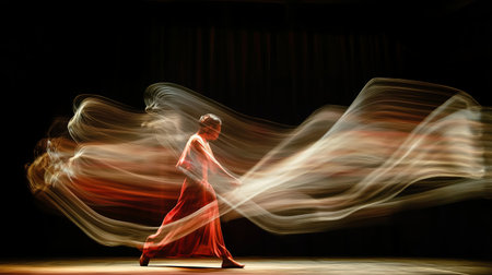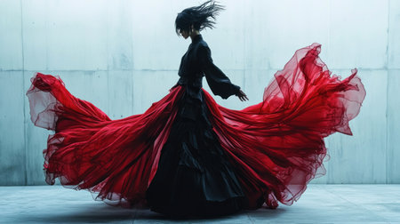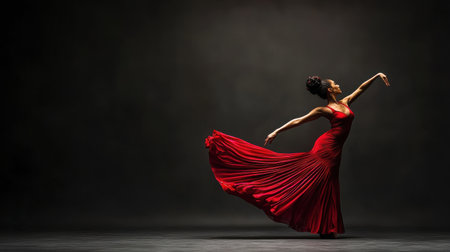 A captivating dance performance showcasing a graceful figure in a flowing red dress. The dynamic composition highlights the elegance and movement against a dark backdrop, evoking emotion and beauty.