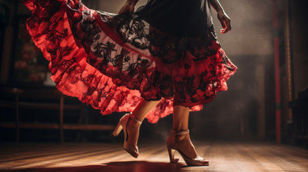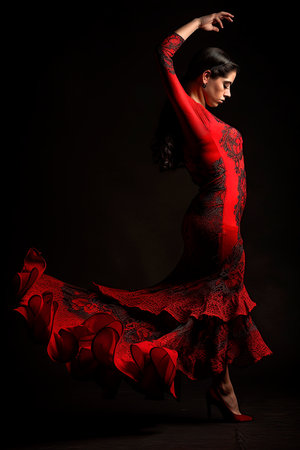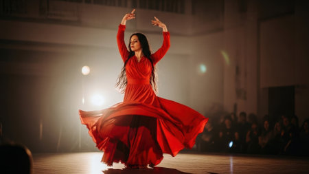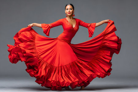 Young woman gracefully swirling her red ruffled dress during a passionate dance performance