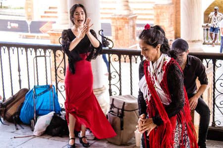 SEVILLE, SPAIN - MAY 2017: Young women dance flamenco on Plaza de Espana