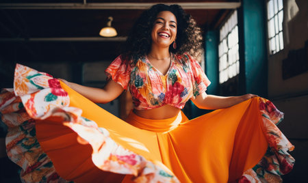 Joyful woman in orange dances vibrantly against a colorful, abstract mural. AI generative.