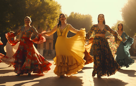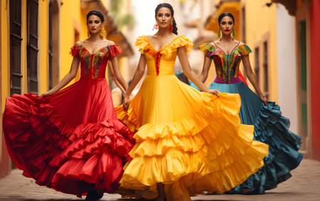 Three beautiful flamenco dancers in colorful dresses dancing in the street.