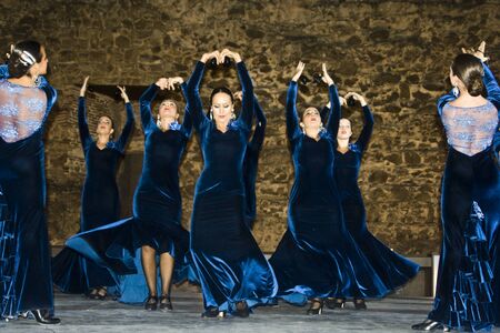 TORRE DEL MAR, SPAIN - JULY 22, 2018 show of Latin dance performed by a dance group in the rhythm of Spanish music, youth in folk costumes performing in front of the audience, dance show