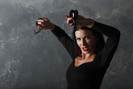Young adult spanish woman dancing flamenco with castanets on gray vintage background
