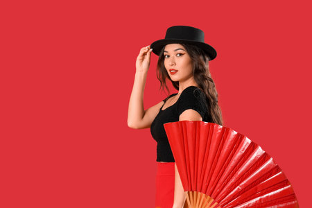 Portrait of beautiful young woman dancing flamenco with fan in studio