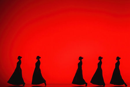 Silhouettes of women dancing gracefully in black dresses against a vibrant red background, exuding elegance and movement, ideal for creative projects