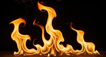 Roaring flames illuminating a black background, creating a bold and intense visual of fire's natural energy