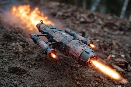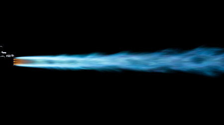 Flames erupt from a jet-like apparatus, illuminating the night sky with vibrant orange and blue hues. Smoke swirls around, creating an atmosphere of thrilling excitement and energy.
