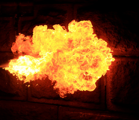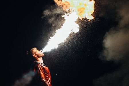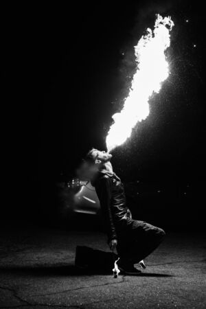 A Fire show artist breathe fire in the dark jamp
