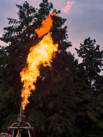 Hot air balloon burner fires up throwing gas flame high into sky