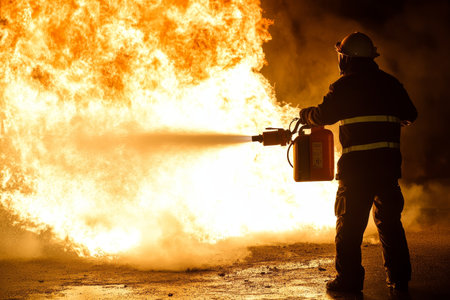 A firefighter in full protective gear uses a powerful extinguisher to combat a massive wall of flames, demonstrating bravery and skill in the face of danger.