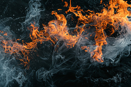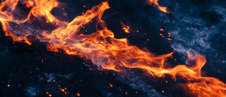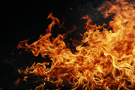 Witness the captivating power of fire with this intense image. A close-up view of fire flames takes center stage against a dark black background, creating a mesmerizing and dynamic composition. The vibrant and flickering flames create a sense of energy and intensity, while the black backdrop adds depth and drama to the scene. Perfect for projects related to heat, energy, passion, danger, and the elemental force of fire