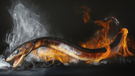 This striking image features an eel emerging from flames and smoke, creating a scene filled with drama and intensity. The surreal composition evokes a sense of danger and curiosity.