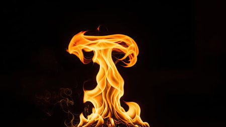 Witness the captivating power of fire with this intense image. A close-up view of fire flames takes center stage against a dark black background, creating a mesmerizing and dynamic composition. The vibrant and flickering flames create a sense of energy and intensity, while the black backdrop adds depth and drama to the scene. Perfect for projects related to heat, energy, passion, danger, and the elemental force of fire
