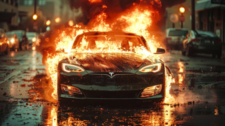 Stock Image of an Electric Car Lithium Battery Fire Caused by Thermal Runaway from Damage or Overcharging. Concept Automotive Safety, Lithium Battery Fire, Electric Vehicle Technology