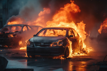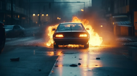 A cars is burning after a protesters set a fire. Burning cars on a city street, smoke and flames all around. AI generated