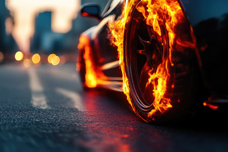 Flames Erupting from a Wheel on a Moving Car in Urban Landscape