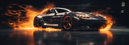 Generative AI, fiery explosion, and heavy black smoke in a sports automobile