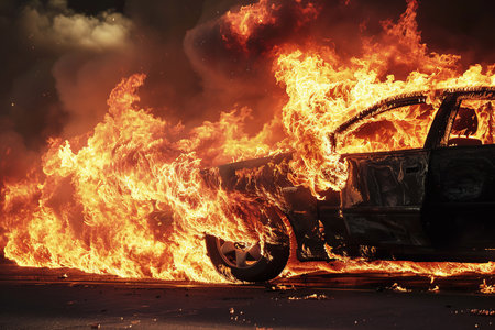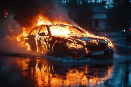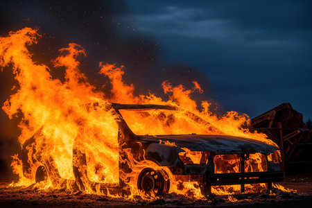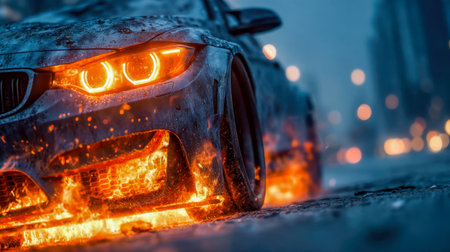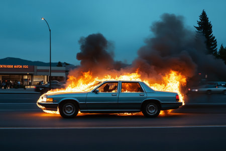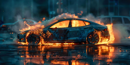 Depicts a car engulfed in intense flames on a street, with smoke and fire sparks rising against a dark blue sky, symbolizing destruction.