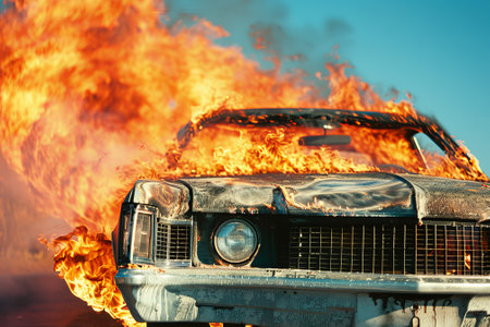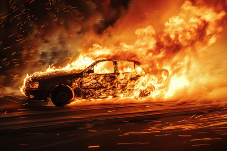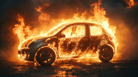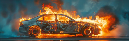 A car on fire, with fiery flames and thick smoke, representing destruction and chaos in a vivid, high-impact scene.