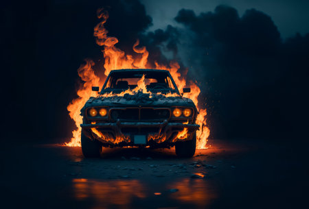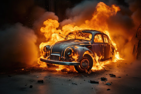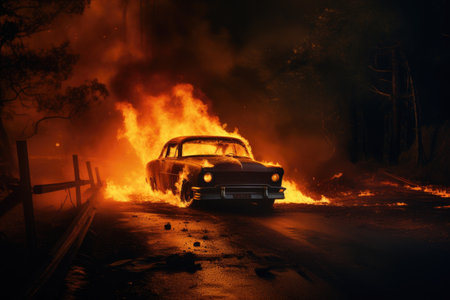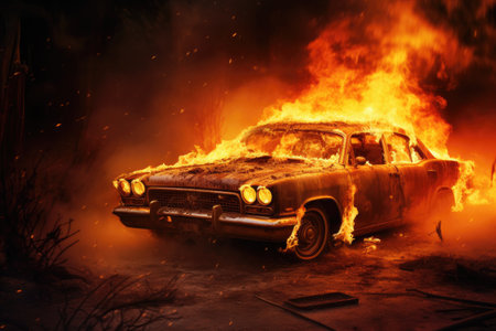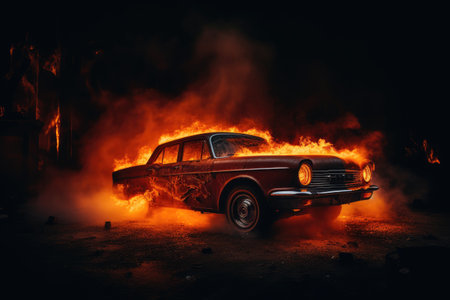 Intense image of a vintage car ablaze in the darkness, dramatic emergency concept, AI generated