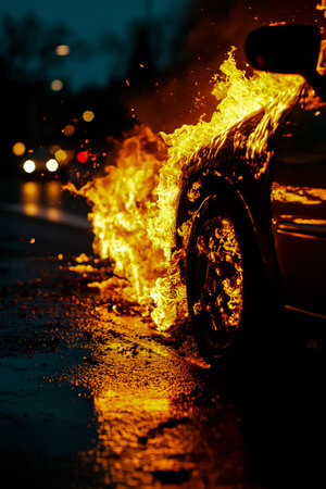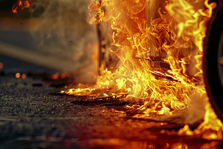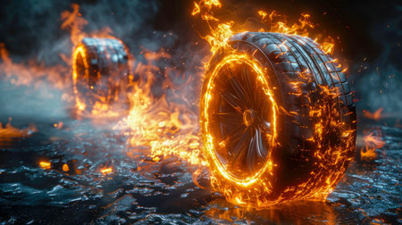 Fiery car tires on wet surface, glowing with intense flames. High-detail image with dark, smoky background. Concept of speed, power, and energy.