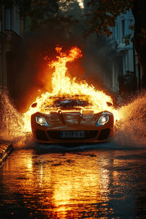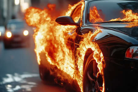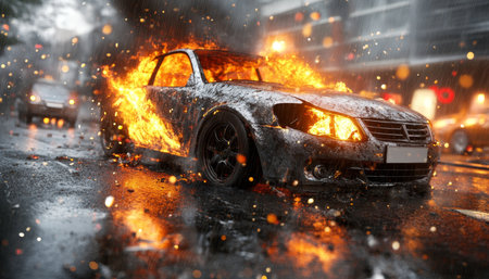 A dramatic scene of a car engulfed in flames on a city street, conveying danger and emergency.