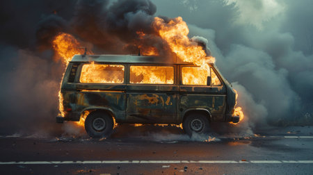 Vintage van engulfed in flames with thick smoke billowing in the background, capturing the intensity and chaos of a fire scene. Emergency and destruction concept.