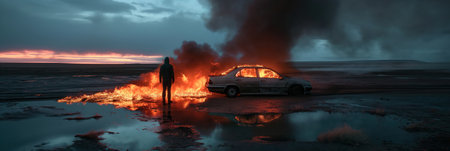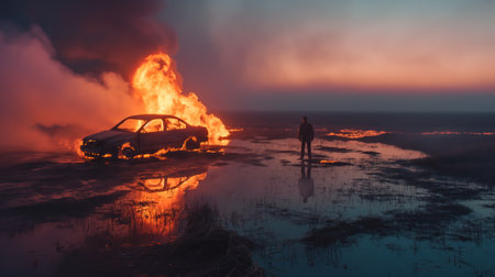 Burning car engulfed in flames on serene prairie landscape at dusk, with lone figure standing in foreground observing scene, as thick smoke rises into dark blue sky, reflects off wet ground, water