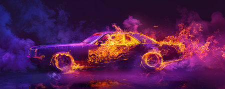 A car on fire, with flames and smoke billowing, isolated on a dark purple background. The intense heat and chaos of the burning vehicle stand out against the deep color.