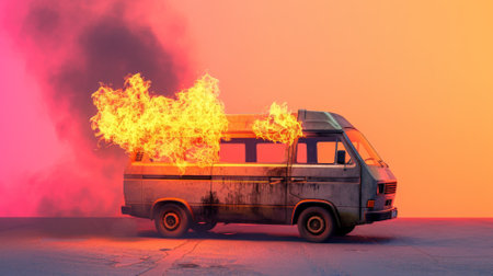 A burning van with roaring flames and dark smoke, isolated on a sunset gradient background from orange to pink. The vivid colors enhance the drama of the scene.