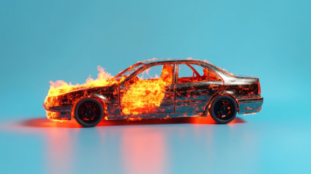 Car on fire amid plain color background, AI Generated