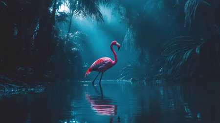 Elegant flamingo in vibrant pink forest reflection. That the image is generated using AI.