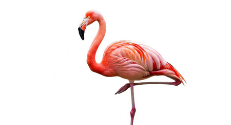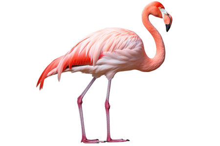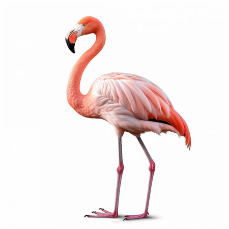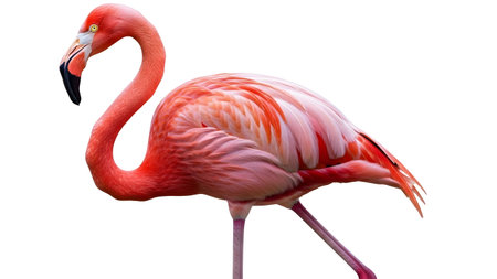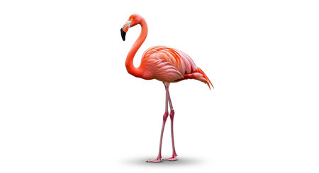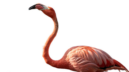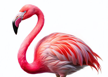 A colorful pink flamingo with a long, elegant neck and vibrant feathers stands isolated on a clean white background
