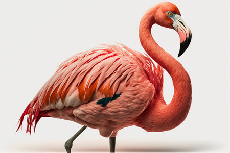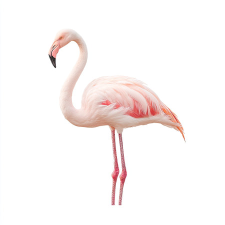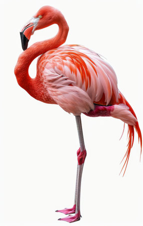 A stunning portrait of a pink flamingo standing on one leg, highlighting its delicate feathers and elegant posture against a clean white background, evoking tranquility.