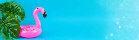 Pink inflatable flamingo on a blue background with monstera leaves. Summer concept of vacation. Background for sale.