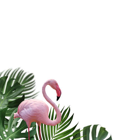 Summer concept design of flamingo and tropical leaves on white background