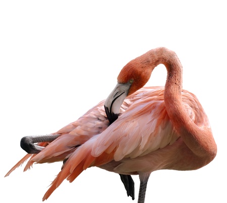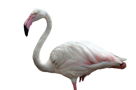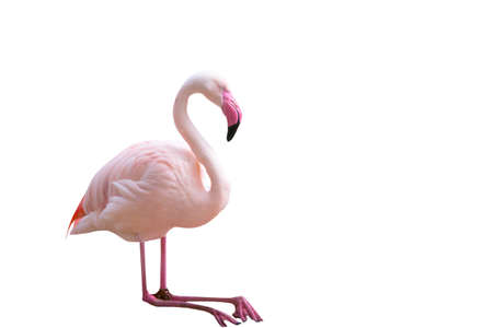 Photo of beautiful and graceful bird flamingo also called phoenicopterus isolated on white with clipping mask. The bird is standing on one leg and has a bent beak and a long neck.