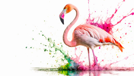 Animal and wildlife theme showing a flamingo bird in multicolored vibrant splashy ambiance. AI generated image with lots of paint splashes, splatters and spots