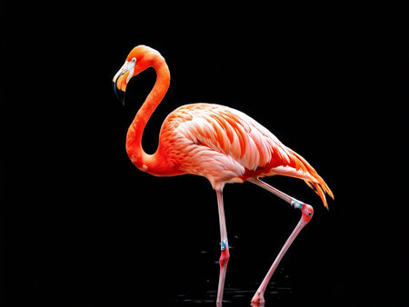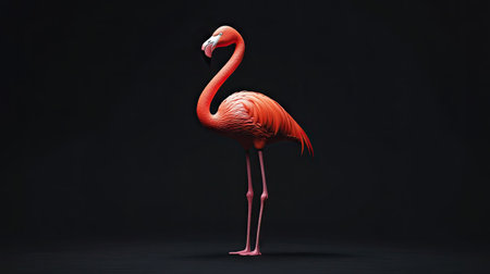 A flamingo standing on one leg, its iconic pose highlighted against a sleek black backdrop.